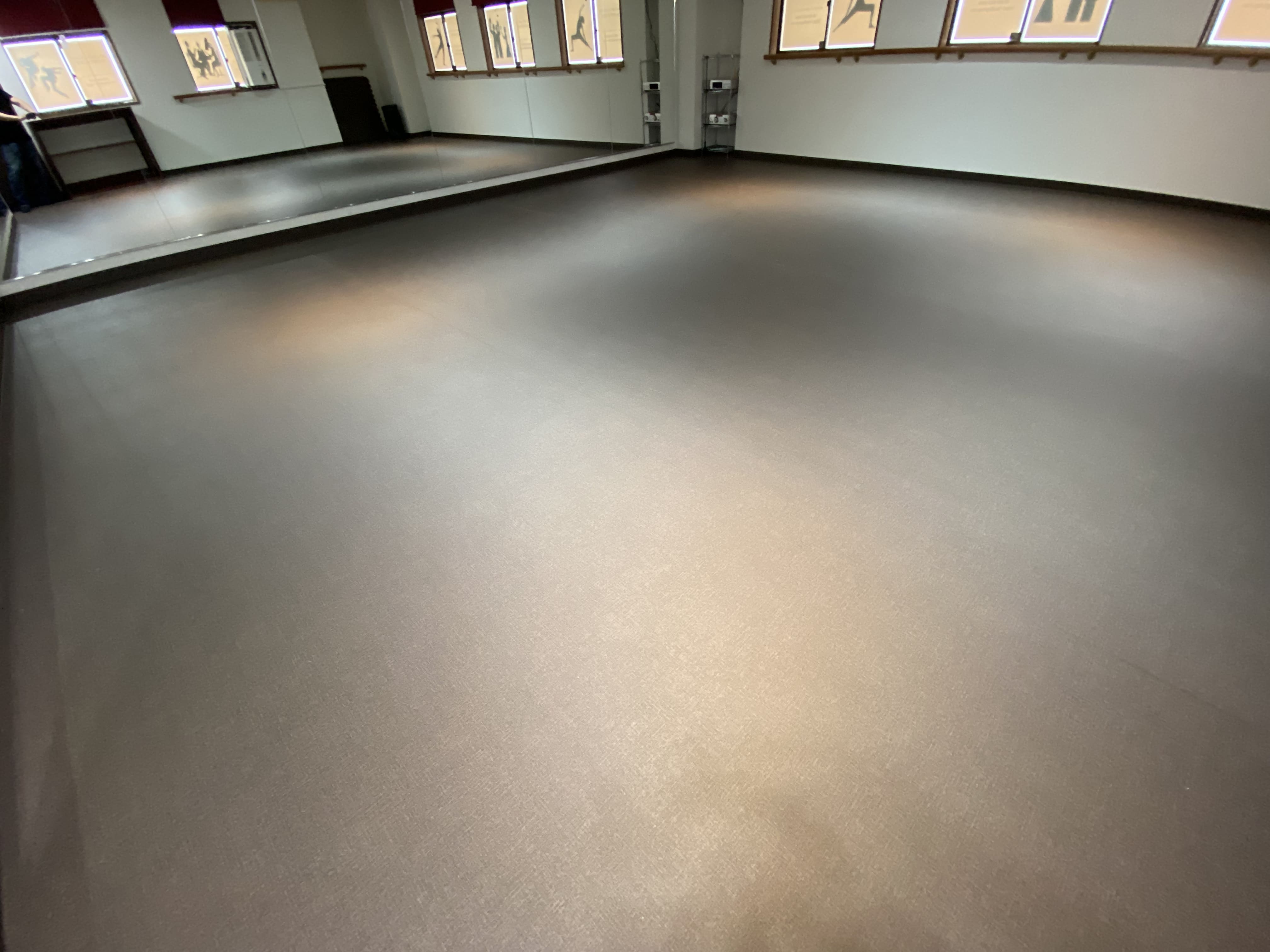 一般的にリノリウムと呼ばれバレエ練習に使われる東リのTMフロアシートを採用。落ち着いた色合いで、ダンスも可能な大好評アリーナフィット仕様。適度な反発性で足腰への負荷や転倒時の衝撃を軽減。
